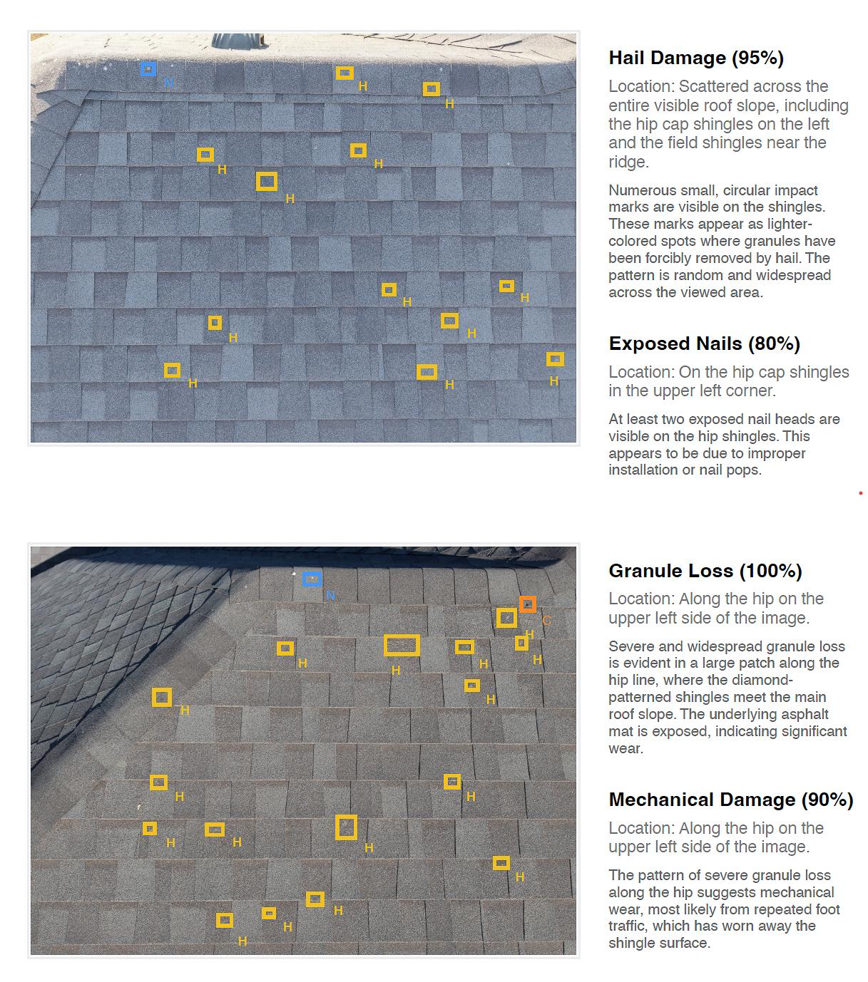 Multiple impact marks were detected across the asphalt shingles, showing areas where hail had displaced protective granules.